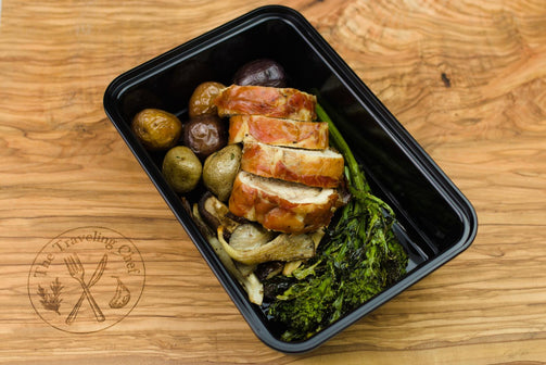 Chicken Ballotine which is a way of cooking chicken, in this particular version it is local chicken thighs from Hilltop Acres, along with ground chicken in the middle, with shallot and thyme, wrapped in Prosciutto, roasted till crispy on the sides. Served with a Sherry Reduction, Roasted Mushrooms, Garlic Rapini and Duck Fat Roasted Potatoes