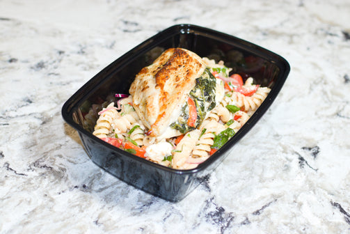 Goat Cheese, Roasted Red Pepper, Spinach and Garlic Stuffed Local Hilltop Acres Chicken Breast with Lemon Oregano Dressed Fusilli tossed with Feta, Cucumber, Cherry Tomato, Parsley, Red Onion and Red Pepper.